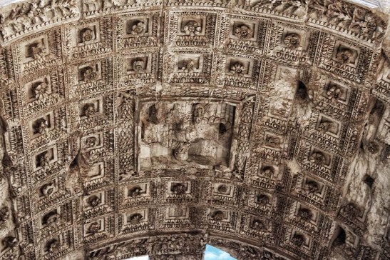 O revestimento interior do arco axial é composto por profundos caixotões e por um relevo da apoteose de Tito no centro. Dois painéis em relevo decoram também o interior da passagem, ambos comemorando o triunfo conjunto celebrado por Tito e seu pai, Vespasiano, no verão de 71. (Wikipédia)
