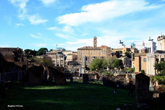 Fórum Romano podendo-se ver ao fundo a construção em mármore branco do complexo do Monumento a Vittorio Emanuele II
