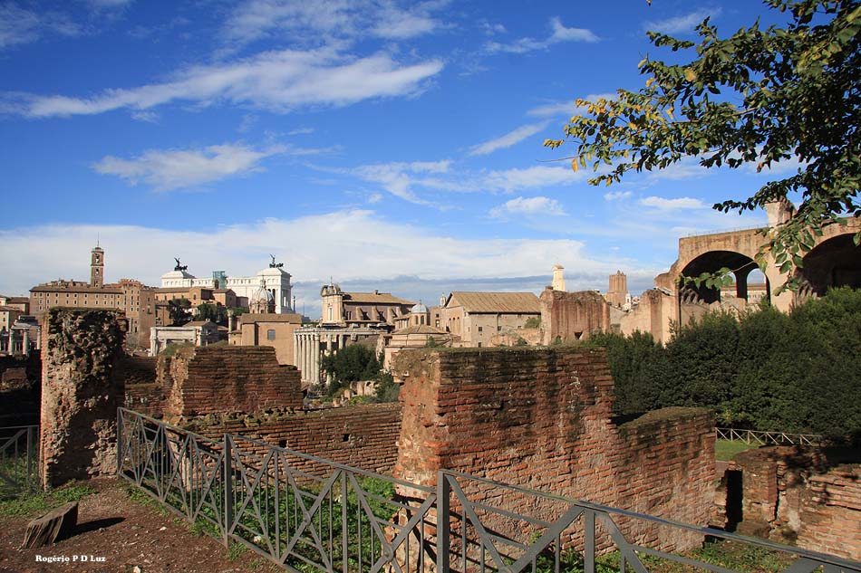 Fórum Romano podendo-se ver ao fundo a construção em mármore branco do complexo do Monumento a Vittorio Emanuele II