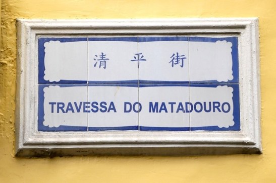Placa toponímica da Travessa do Matadouro, cuja designação em chinês é “Cheng Peng Kái” (清平街, isto é, Rua de Cheng Peng). Foto MV Basílio