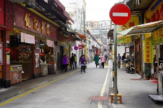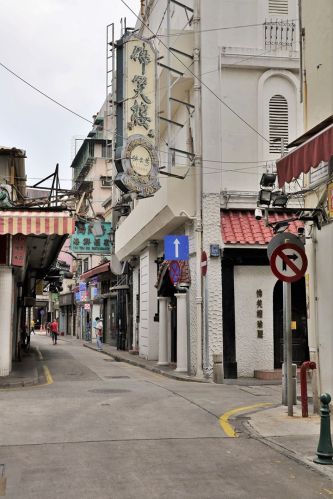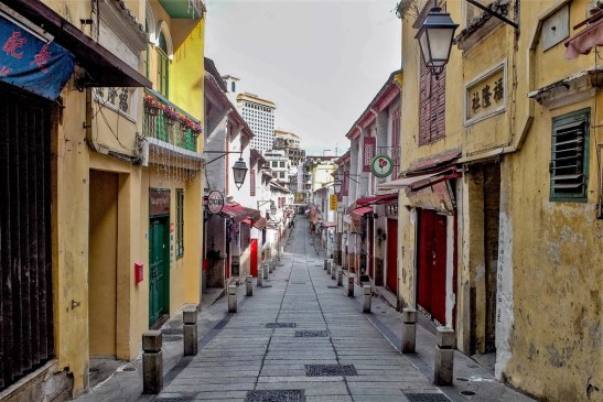 Em frente, é a Travessa do Mastro, vista a partir da Travessa da Felicidade. A via que intersecta com as referidas travessas é a Rua da Felicidade. O estabelecimento pintado na cor bege é o Restaurante Fat Siu Lau. Foto MV Basílio