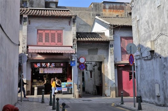 O conjunto de prédios do Beco da Felicidade. No lado esquerdo, está uma das casas recuperadas, que actualmente serve para a divulgação de cultura, denominada “Hall de Cultura” (文化公所). Foto MV Basílio