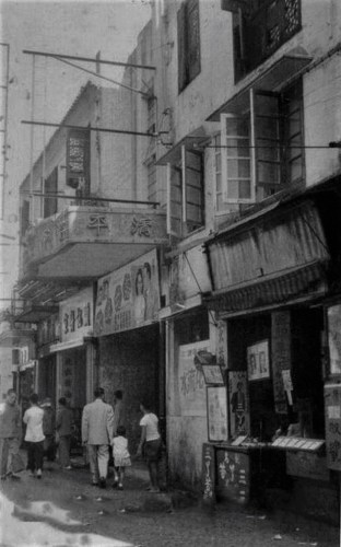 Um troço da Rua da Felicidade, em finais dos anos 50 do século passado. Do lado esquerdo, vê-se a Hospedaria San Va e, a seguir, a casa de Fantan Sui Ching; do lado direito, o Restaurante Fat Siu Lau; e, mais ao fundo, uma Casa de Pasto, uma Casa de Penhores, uma loja de vinho chinês, um hotel,etc.