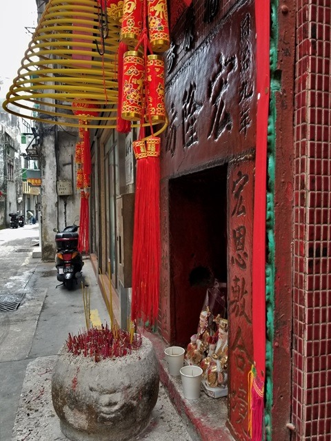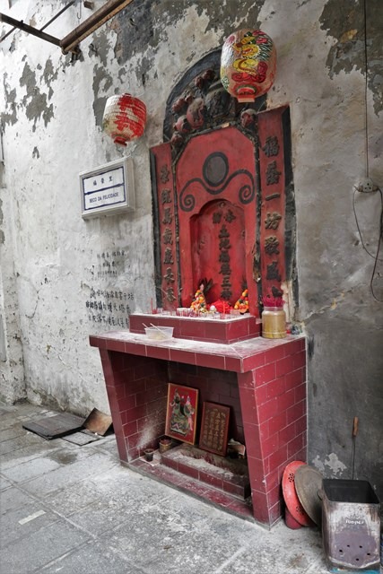 Altar de rua, localizado no fim da Rua do Matapau. Em cima, há 3 grandes caracteres chineses ( 宏隆坊 ), escritos horizontalmente, que significam Bairro de Wang Lông e, do lado direito, 4 caracteres (同治九年), escritos verticalmente, que significam 9º ano do Imperador Tongzhi (同治帝), correspondente ao ano de 1870. Foto MV Basílio.