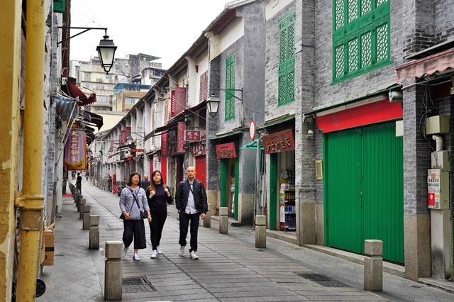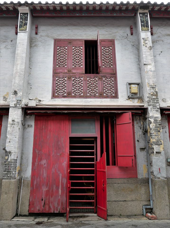 Aspecto de um dos prédios localizados na Rua da Felicidade. Originalmente, as paredes eram revestidas de tijolo cinzento, sem pintura, e as portas e janelas, pintadas na cor verde, uma pintura que nada tinha a ver com o chamado “bairro vermelho”. A pintura na cor vermelha foi feita em 1996, durante a administração portuguesa, quando foram realizadas as obras externas de restauro. Foto MV Basílio