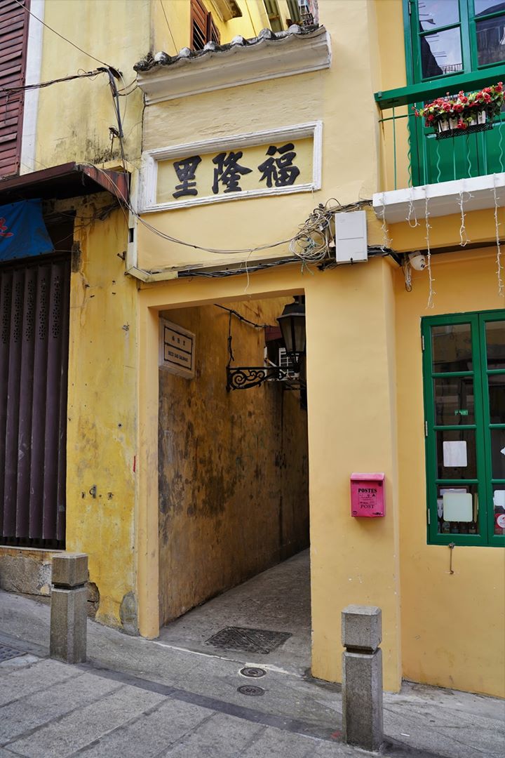 [4] Além do antigo bairro “Fôk Lông”, donde nasceu, a partir dos aterros, o novo Bairro da Felicidade, havia ali próximo, nomeadamente o antigo bairro “Wang Lông” (宏隆坊 , “Wang Lông Fóng”), na zona do Matapau, e o antigo bairro “Tâk Lông” (德隆坊 , “Tak Lông Fóng”), que apenas resta um portal e uma curta via designada Pátio do Cotovelo. No lintel do portal deste Pátio, há 3 inscrições: a do centro, estão gravados os caracteres chineses 德隆新街 (Tâk Lông Sân Kái), podendo “Tâk Lông”, literalmente, significar “Virtude Abundante” e, “Sân Kái” quer dizer “Rua Nova”; a inscrição do lado direito é 咸豐己未冬初 (que quer dizer “9º ano do Imperador Xianfeng”, correspondendo, assim, ao ano de 1859); e, do lado esquerdo, 里人建立 (cujos caracteres significam “construído pelas pessoas do interior” da rua).