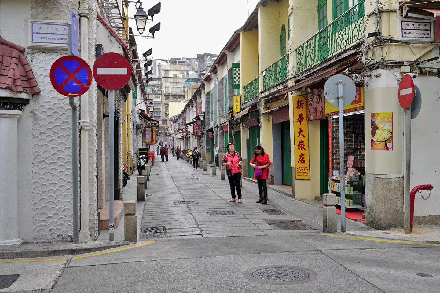Em frente, é a Travessa do Mastro, vista a partir da Travessa da Felicidade. A via que intersecta com as referidas travessas é a Rua da Felicidade. O estabelecimento pintado na cor bege é o Restaurante Fat Siu Lau. Foto MV Basílio