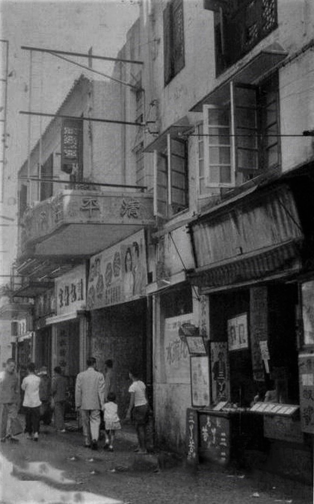 Entrada principal do Teatro Cheng Peng, em meados do século passado. No lado direito, está a loja de Chá Medicinal Ün Iec (玄益涼茶 ), que em Janeiro de 2020 ainda se encontrava em atividade.