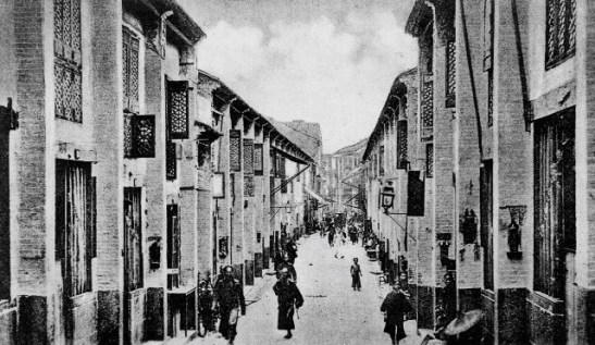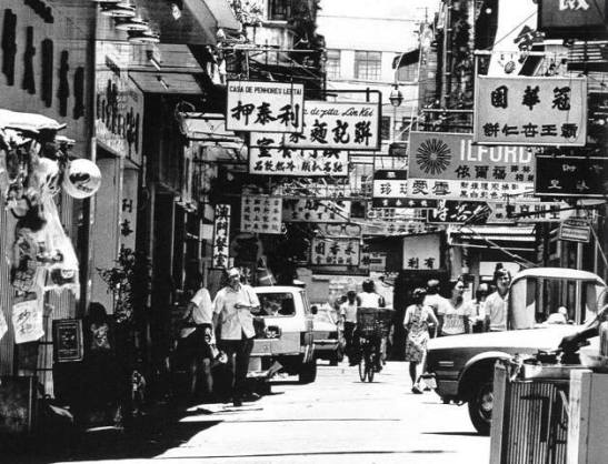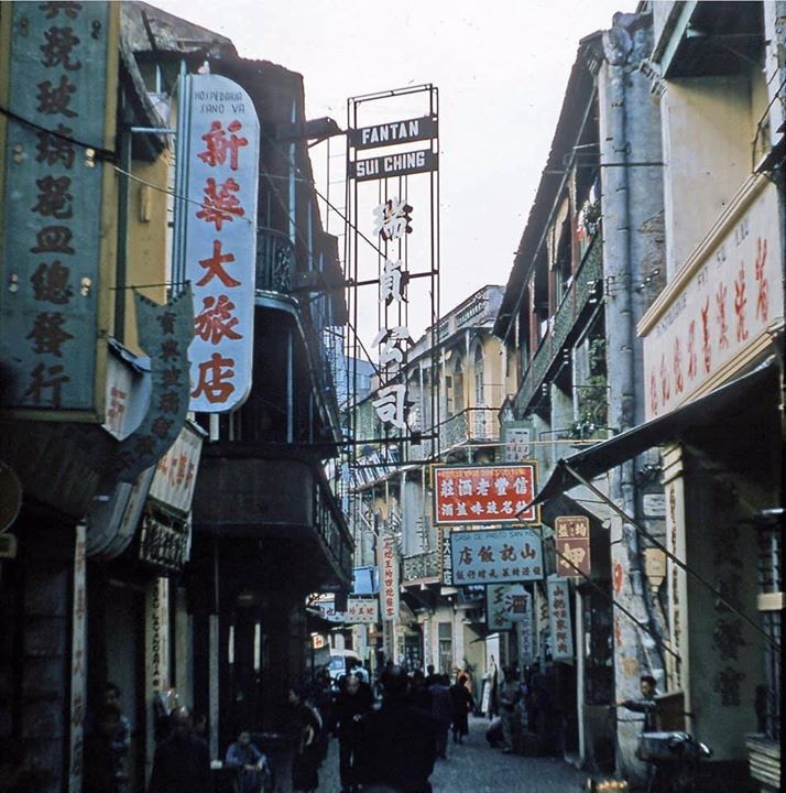 Um troço da Rua da Felicidade, em finais dos anos 50 do século passado. Do lado esquerdo, vê-se a Hospedaria San Va e, a seguir, a casa de Fantan Sui Ching; do lado direito, o Restaurante Fat Siu Lau; e, mais ao fundo, uma Casa de Pasto, uma Casa de Penhores, uma loja de vinho chinês, um hotel,etc.