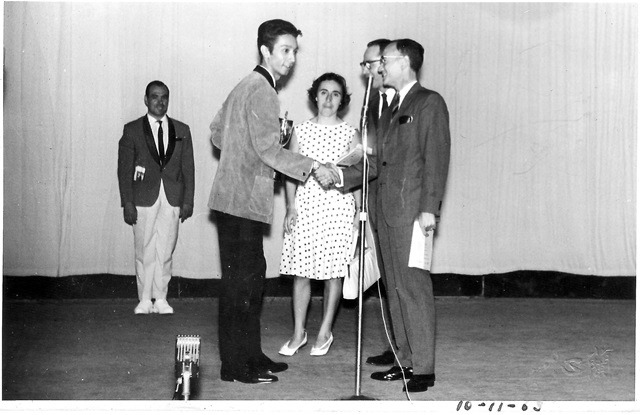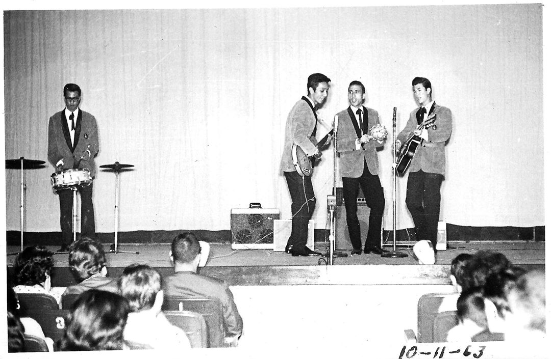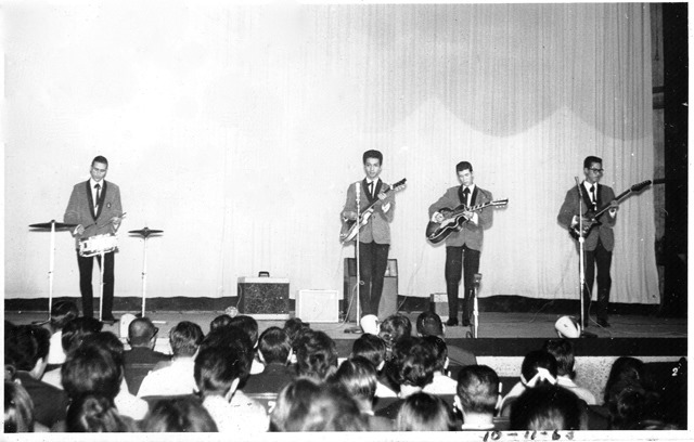 Actuação do conjunto “The Grey Coats”, no 1º Festival de Música, realizado no Teatro Cheng Peng, em 1963. Foto: Cortesia de Leonardo Amarante