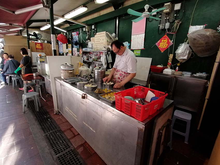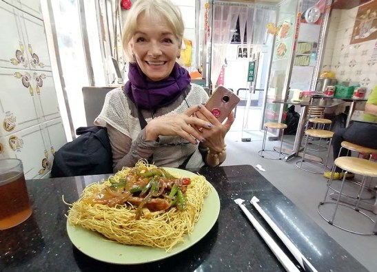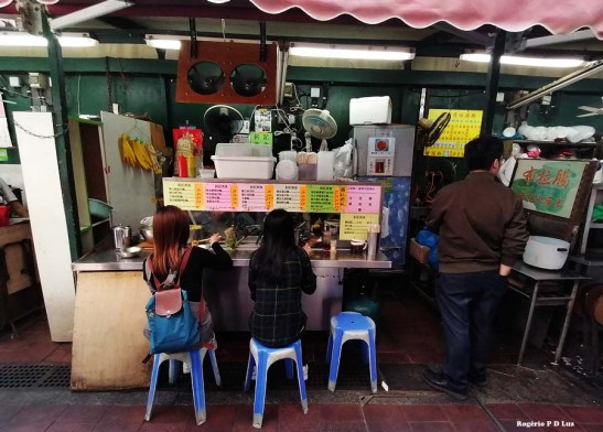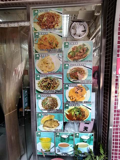 O restaurante abaixo foi o nosso ponto de parada para o almoço. O que atraiu foi o ‘pái kuat fán“, no topo direito da foto como baked pork chop with rice (costelinha de porco assado com molho de tomate adocicado e arroz). Não tão perfeito como o do restaurante Fát Siu Lau da Rua da Felicidade, mas é bem parecido com preço bem menor. A Mia pediu um cháu min, ou sâp cháu min ou macarrão frito sem estar mergulhado em molho. Era esquisito pela forma como o macarrão foi servido, como podem ver na foto, mas estava bem delicioso.