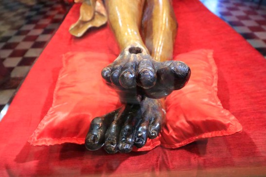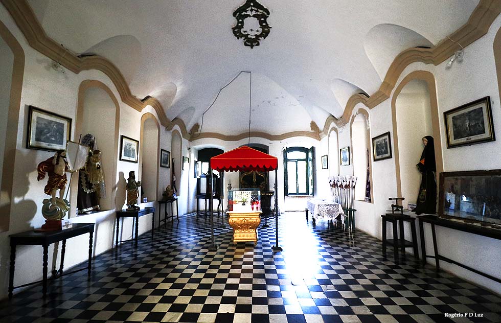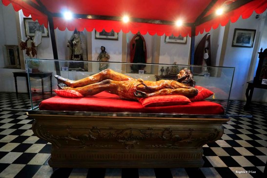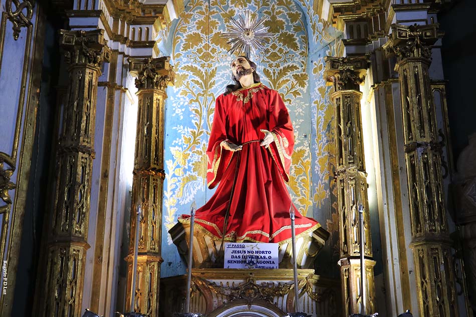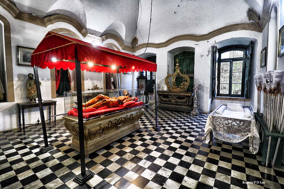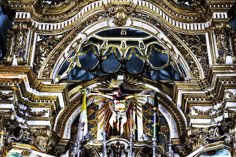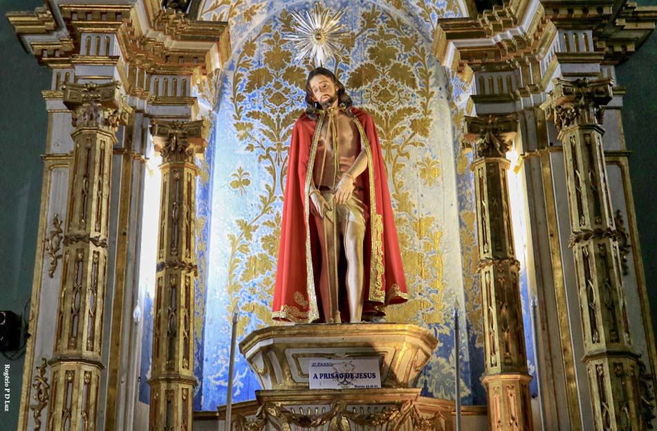 Imagem do Cristo em tamanho natural, com 2 mil fragmentos de pedras de rubi indiano incrustados nas chagas, esculpida no século XVIII, em cedro, pelo escravo Francisco Xavier das Chagas – o Cabra.