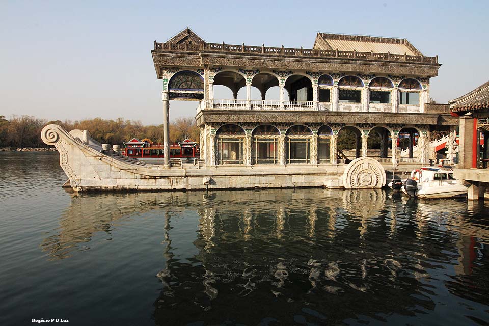 O Barco de Mármore, cuja superestrutura é feita de madeira, pintada de branco de modo a parecer mármore. Conta a história que a Imperatriz Cixi pagou por essa extravagância dispendiosa com fundos destinados à modernização da Marinha Imperial: