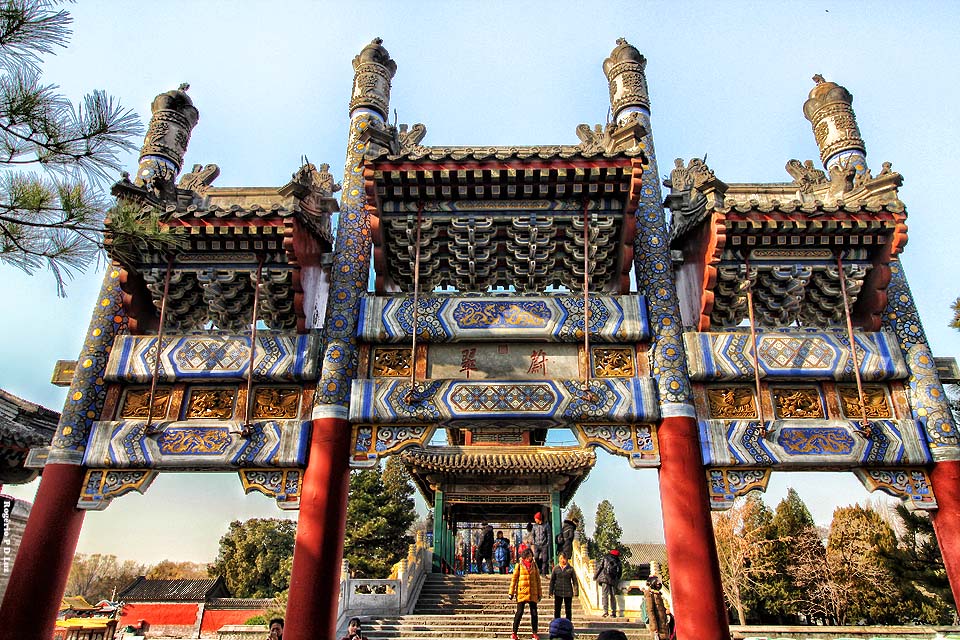 O arco ornamental diante do complexo da Colina de Longevidade, com típica inscrição de quatro ideogramas na placa azul ao centro: