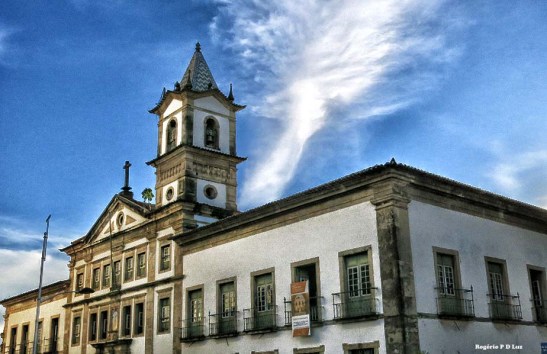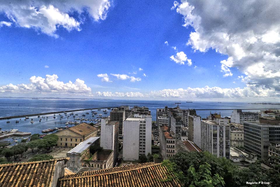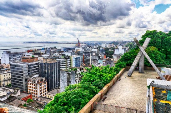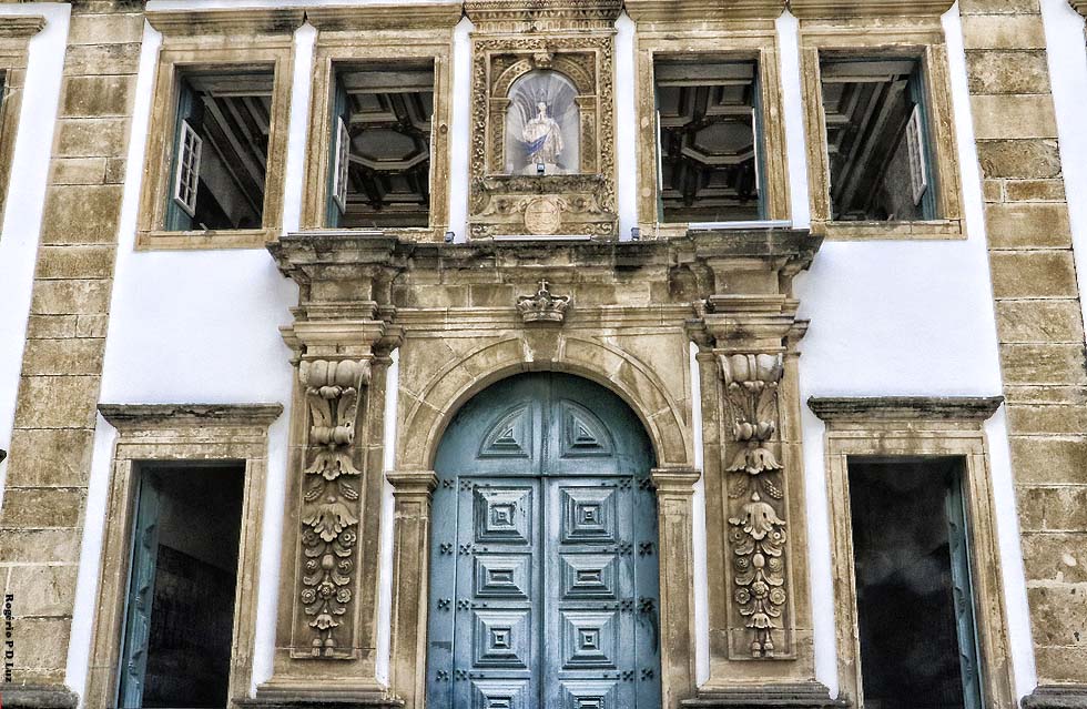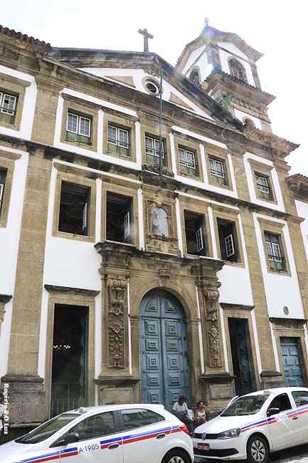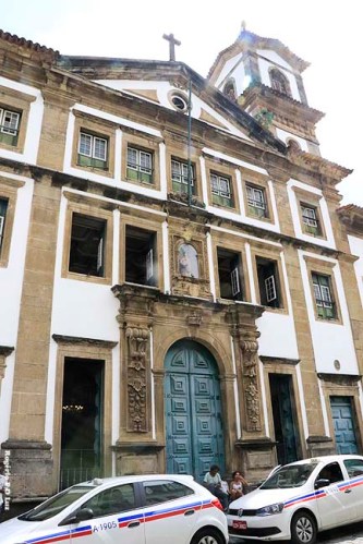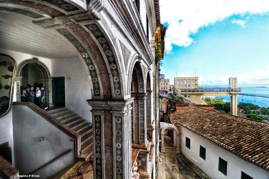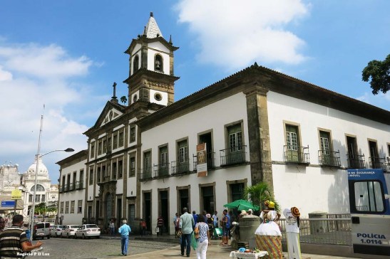 A Igreja e Museu da Misericórdia tendo ao fundo, o prédio branco do Palácio Rio Branco na Praça Tomé de Souza onde se encontra o Elevador Lacerda.