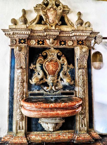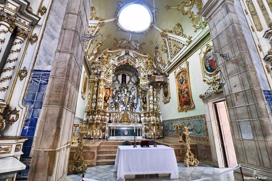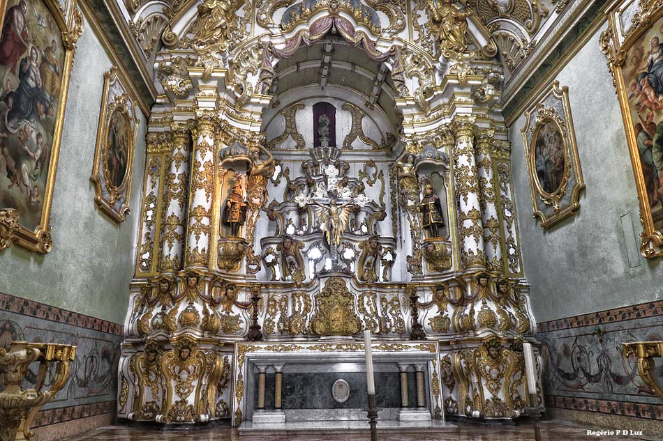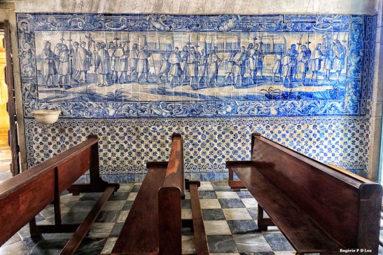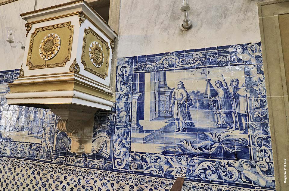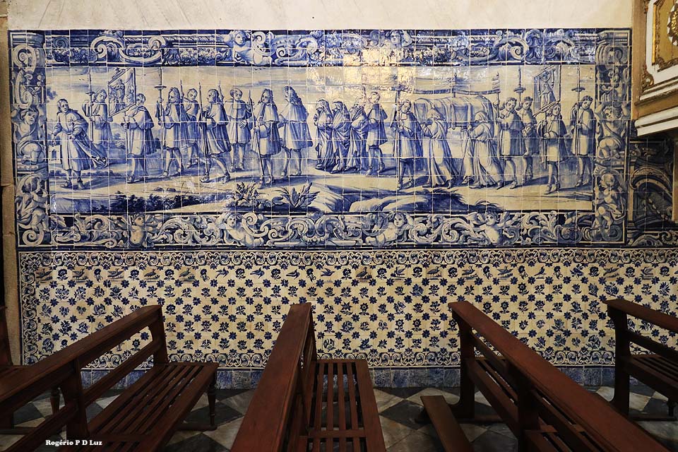 Painéis de azulejos portugueses em estilo barroco retratam a Procissão do Fogaréu e a Procissão dos Ossos, além de figuras de convite ou de guarda, datados do século XVIII