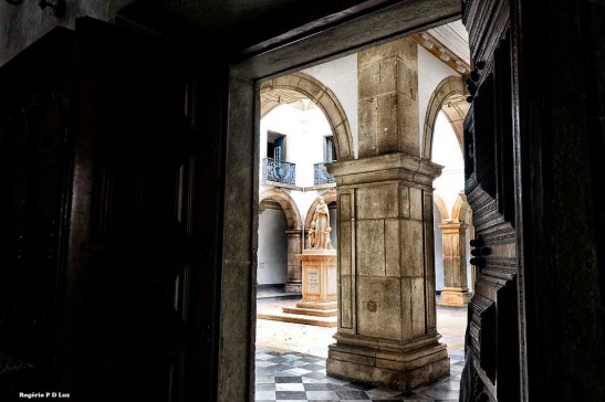 As arcadas do pátio principal em pedra de cantaria e no centro, a Estátua da Caridade.