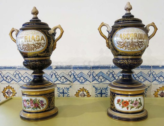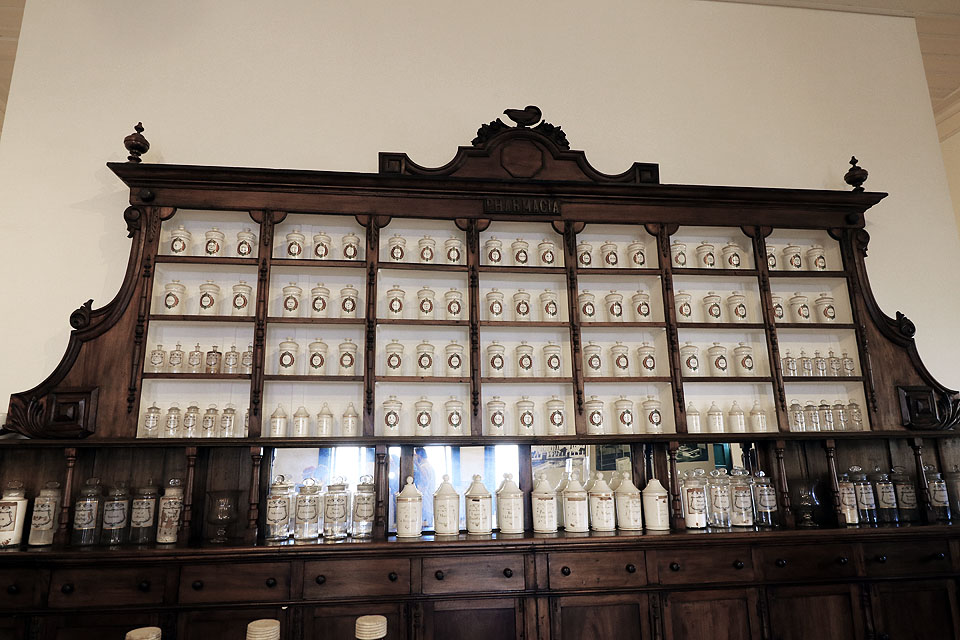 Em exposição, o mobiliário do Século XIX da antiga farmácia de manipulação do Hospital de Caridade com variados potes e frascos.