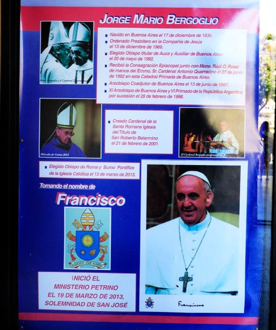 Cartaz na entrada da Catedral conta a trajetória do Cardeal Jorge Maria Bergoglio até ser eleito Papa Francisco. No seu interior há um museu em homenagem ao Papa expondo objetos pessoais e litúrgicos utilizados durante os 15 anos do seu ministério pastoral na Cidade.