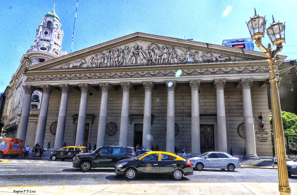 Em 1822, os franceses Próspero Catelin e Pedro Benoit desenharam a fachada, cujas 12 colunas simbolizam aos doze apóstolos de Jesus. No interior tem naves, capelas laterais e um cruzeiro instalado debaixo de uma majestosa cúpula de 41 metros de altura. Outro detalhe de importância é a ornamentação da fachada, realizada em 1860 pelo escultor francês Joseph Dubourdieu, autor da figura que se encontra na cúspide da Pirâmide de Maio, e que realizou o baixo-relevo do frontispício, que representa o encontro de Jacó com seu filho José no Egito.