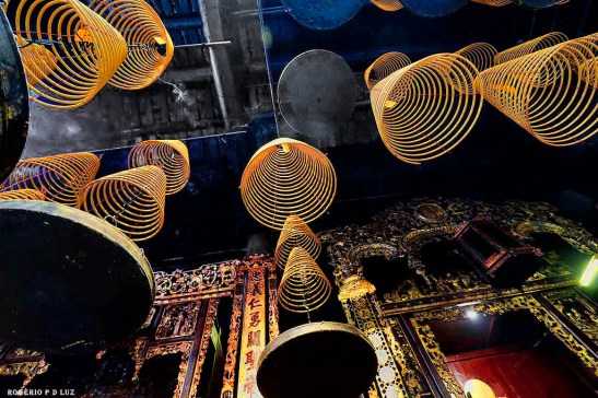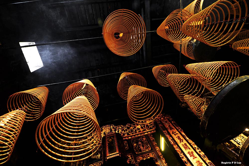 Os templos chineses em Macau ostentam enormes espirais de incenso pendurados no teto.