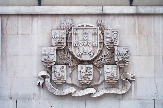 Brasão de armas simbolizando o Império Português, numa peça de arte arquitectónica para o Banco Ultramarino português, O brasão representa (da direita sentido horário), Macau, Cabo Verde, Guiné portuguesa, Moçambique, Índia portuguesa, São Tomé e Príncipe e o Timor português. Angola não é representado porque tinha um banco emissor separado: