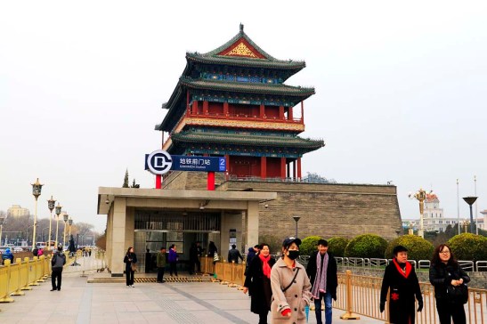 Na saída da estação de metrô, pode-se visualizar, a torre Jin Lou ou Portão da Flecha que fica noutro lado da rua, e que compõe com a torre Zhengyangmen, o Portão de Frente Qianmen.