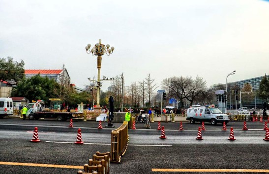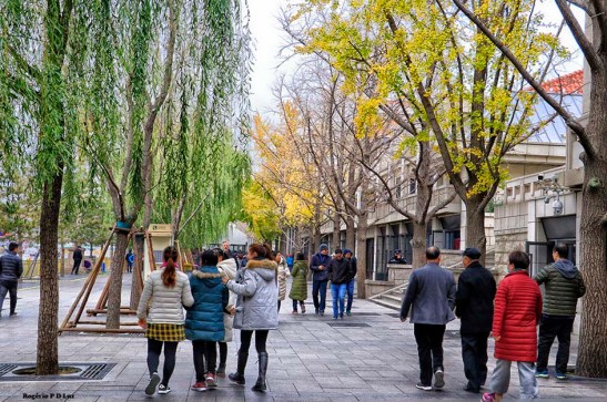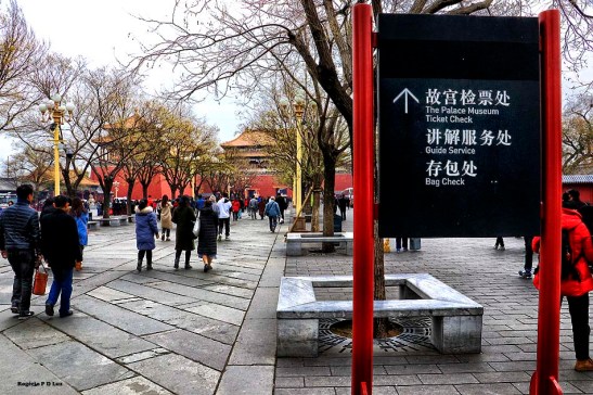 Alameda arborizada conduz ao posto de fiscalização, com detector de metais, para aceder à Praça Tian’anmen. Perde-se um tempo razoável pela multidão de turistas da própria China que gostam de fazer turismo pelo país.