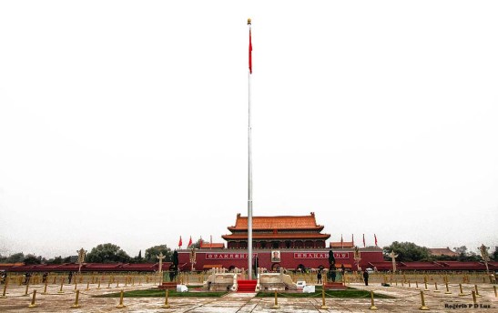 A caminho do fim da Praça Tian’anmen com vista da Porta de Tian’anmen ou Porta da Paz Celestial e o espaço para hasteamento da bandeira nacional da China.