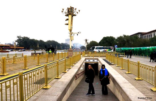Travessia subterrânea da avenida Chang’an Jie, da praça para a Porta de Tian’anmen ou Porta da Paz Celestial. Só há o sentido de ida, não sendo permitido o retorno após passar pelas forças de segurança na saída.