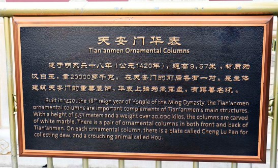 A placa abaixo, conta que a coluna da foto acima foi construída em 1420 na Dinastia Ming. Com uma altura de 9,57 metros e pesando cerca de 20.000 kg, foram esculpidos em mármore branco. Um par de colunas enfeita a parte diante da Porta da Paz Celestial e outro par na traseira.
