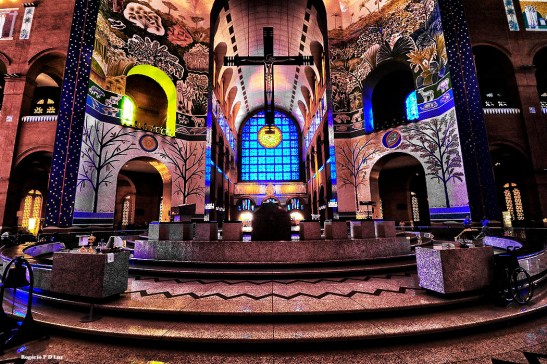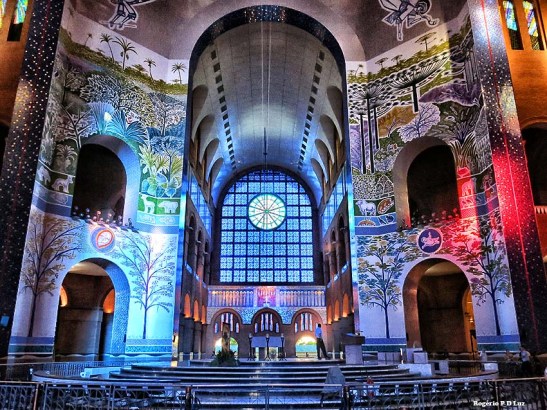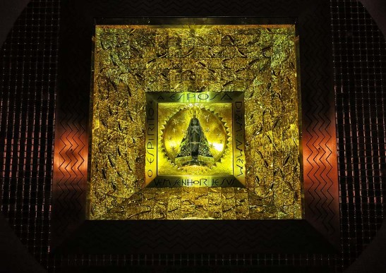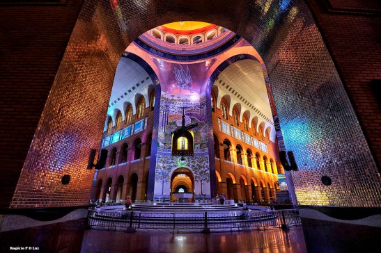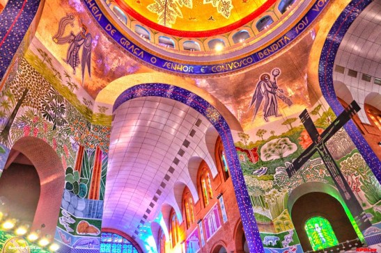 Agora, nas naves Norte e Sul, do nicho da imagem original de Nossa Senhora Aparecida pode-se visualizá-lo com o vitral azul/vermelho do lado oposto. E interessante que pode-se posicionar de tal forma que permita o encaixe o ponto vermelho desse vitral no coração de Jesus na cruz.