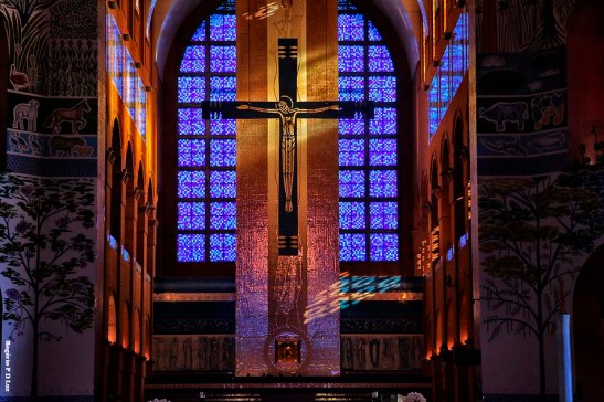 A silhueta de Cristo no crucifixo é vazada que tem o significado que está presente apenas em espírito.