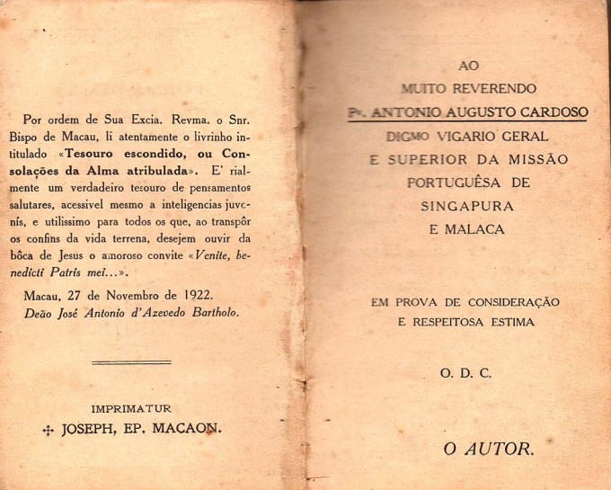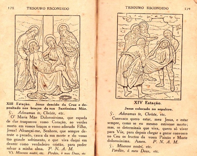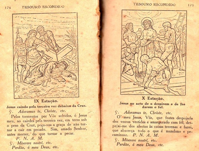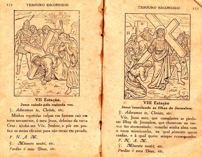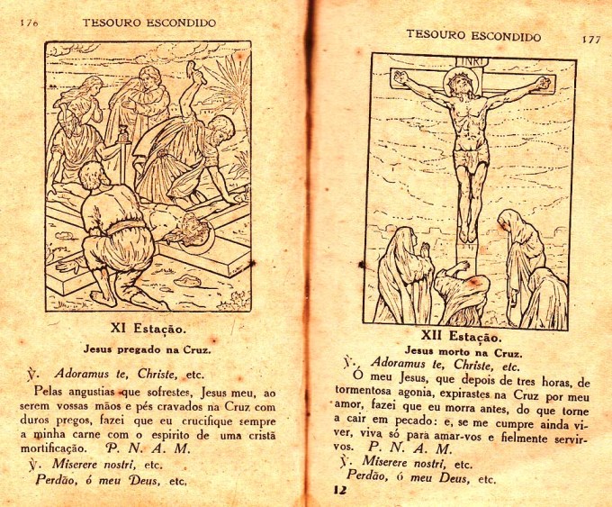 Na Semana Santa de 2021, neste momento difícil para o mundo pela pandemia do Covid-19, publico nesta postagem, páginas da Devoção de Via Sacra extraídas do livro de orações “Tesouro escondido ou Consolações da Alma atribulada“, de autoria do Padre João Clímaco do Rosário, impresso em 1923, há 98 anos atrás, em Macau (antigo território português na China devolvido em 1999) na Tipografia do Orfanato da I. Conceição. O livrinho pertencia à minha mãe Marcelina da Luz.