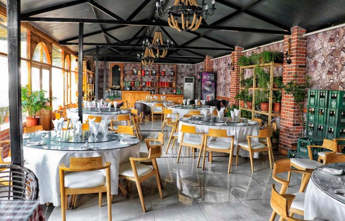 No pacote contratado com a agência de turismo incluía almoço que aconteceu num dos prédios no sopé da muralha