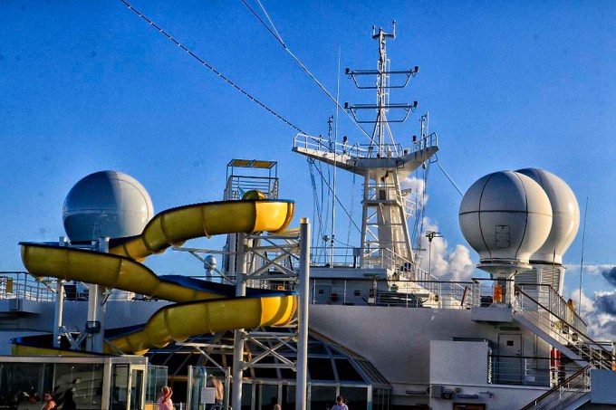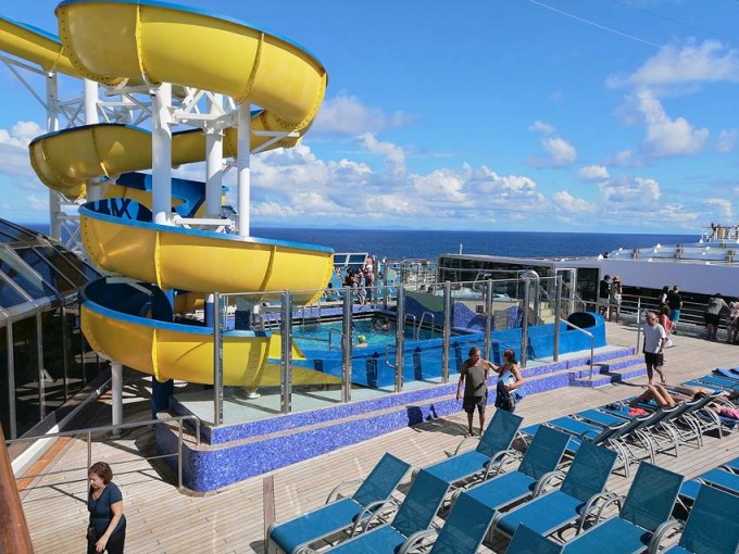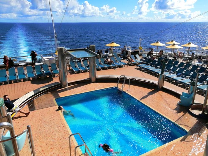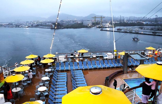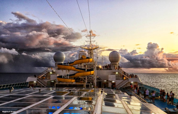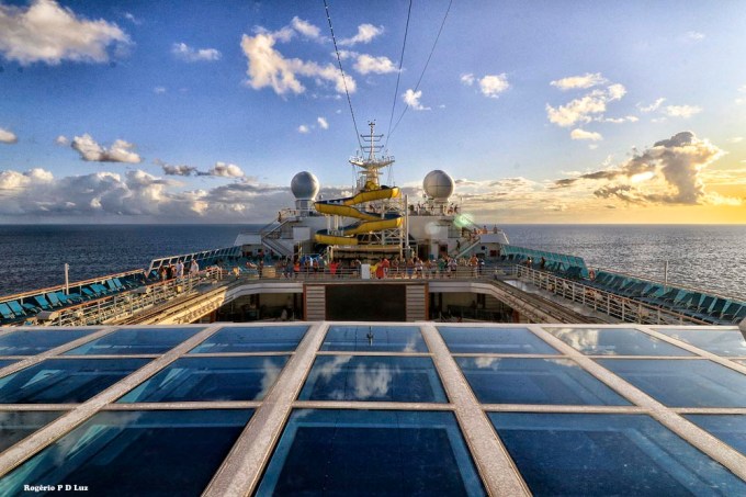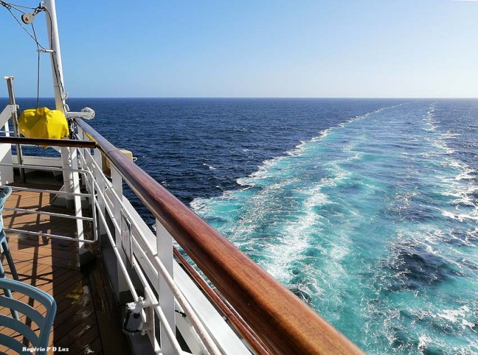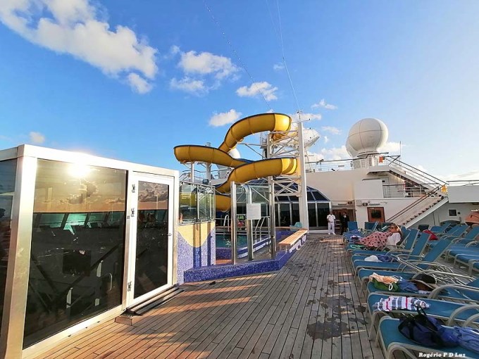 Dos lugares mais gostoso do navio é a popa (traseira) do navio, tanto para curtir a piscina como contemplar esta bela paisagem sentado no deck superior com vista panorâmica.