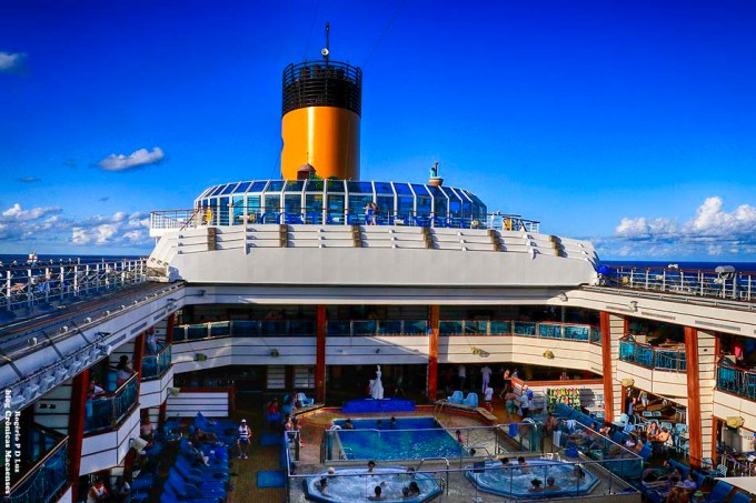 Nesta segunda postagem sobre o navio Costa Fascinosa, mostramos imagens da área externa do navio onde estão as piscinas, espaços para descansar e contemplar o mar, fazer nada, só relax, ou até corredores para caminhada ou jogging, entre tantas outras atividades. Essa é a vida de um cruzeiro que para quem gosta, ama-o demais e vicia. Sempre quer fazer outro! Embora, há que reconhecer que existe quem se decepciona, odeia e nunca mais quer voltar.