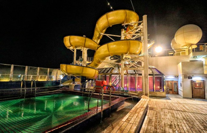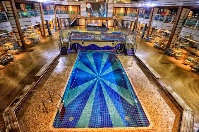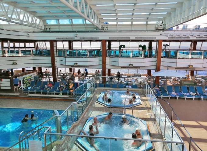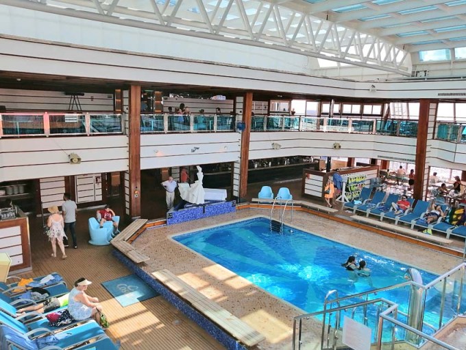 Um detalhe importante do Fascinosa é a piscina coberta. Veja na foto abaixo o teto de vidro que desliza para cobrir a área de uma das piscinas no centro do navio.