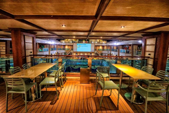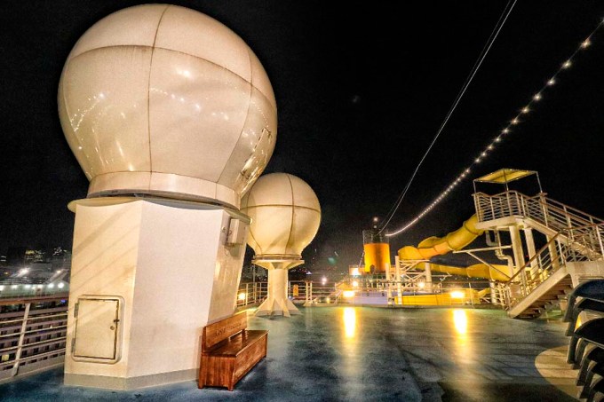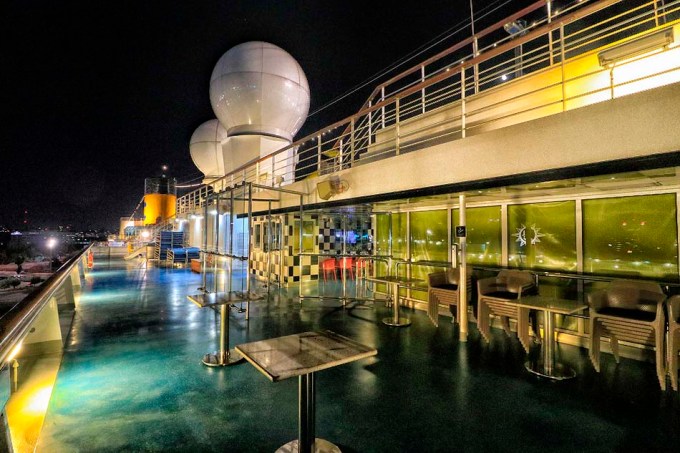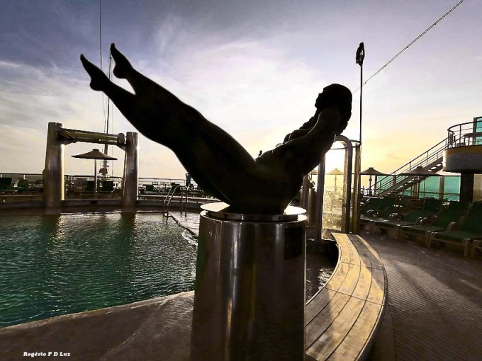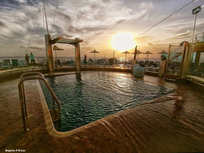 Venha passear pelas imagens que fiz durante o dia e à noite, após as 23:00 horas, quando o deck superior estava vazio com cadeiras externas recolhidas.