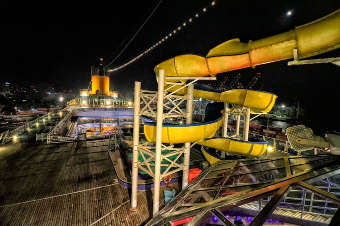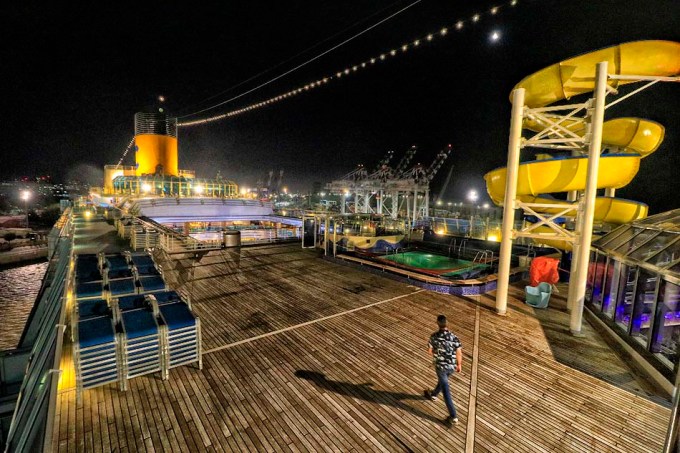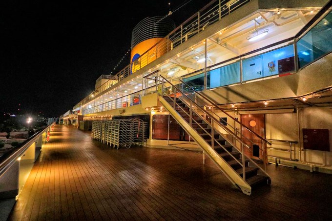 Uma interessante experiência é passear pelos decks vazios à noite. Eram lá pelas 23:00 horas e pouca gente se aventurava a circular pelos ambientes vazios. Todos estava nos ambientes internos com muitas atividades acontecendo.