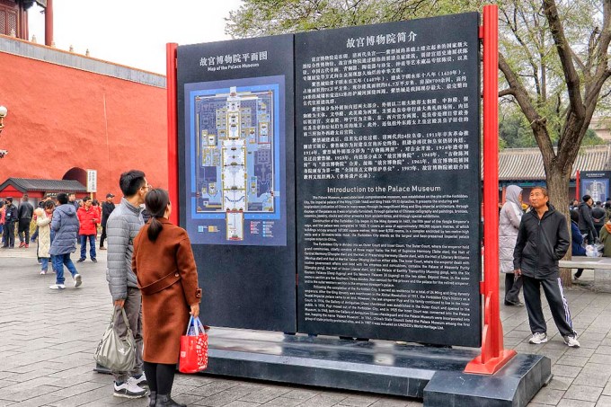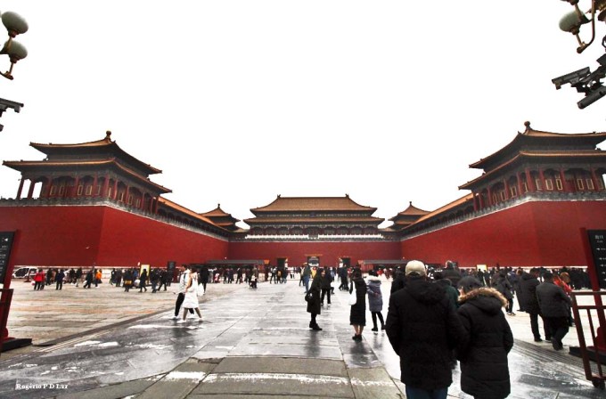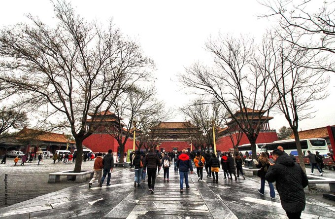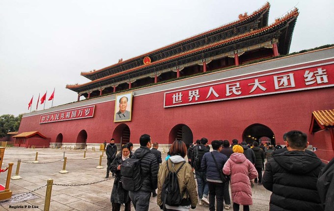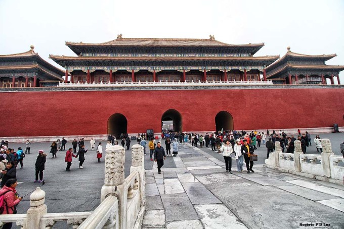 O primeiro acesso para a área da entrada oficial para o complexo cercado se faz pelo Portão Tiananmen (acima), a famosa construção com a fotografia de Mao Tse Tung que fica diante da Praça da Paz Celestial.
