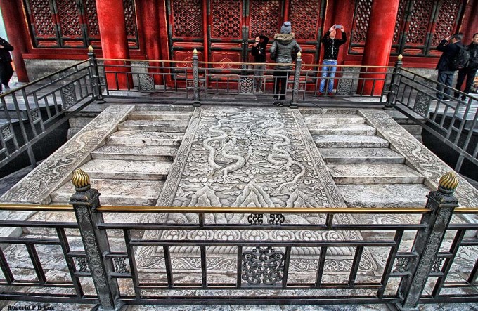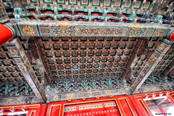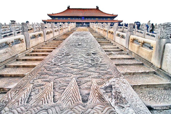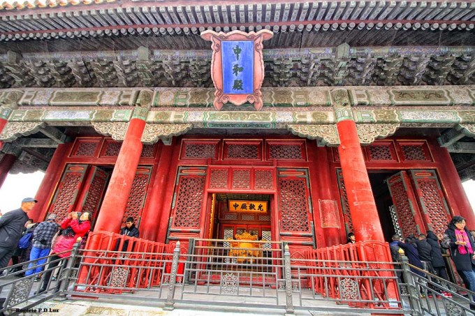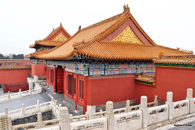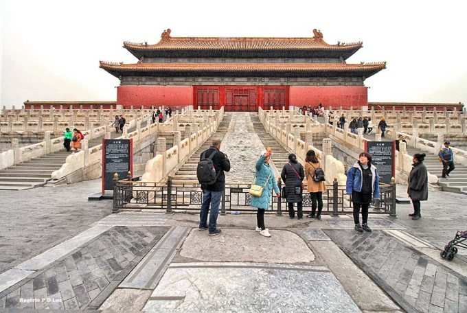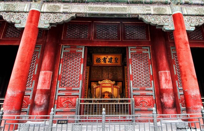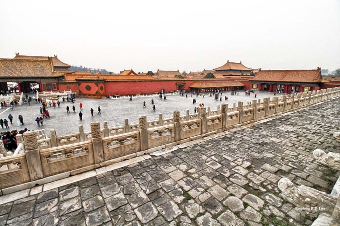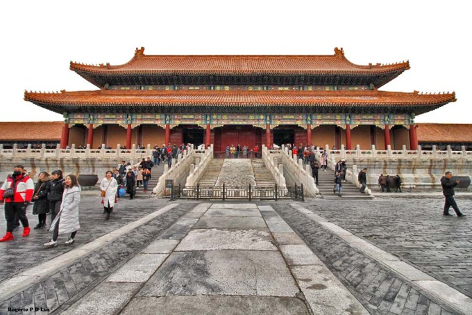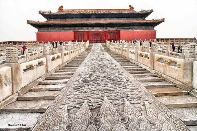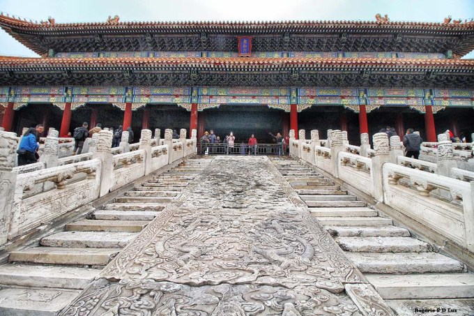 Nas três fotos seguintes, a Galeria da Harmonia Suprema vista das escadarias de mármore do Portão do mesmo nome. É a maior sala do Palácio. Em ocasiões importantes, era utilizada para entronização de um imperador.