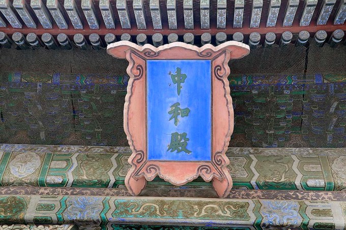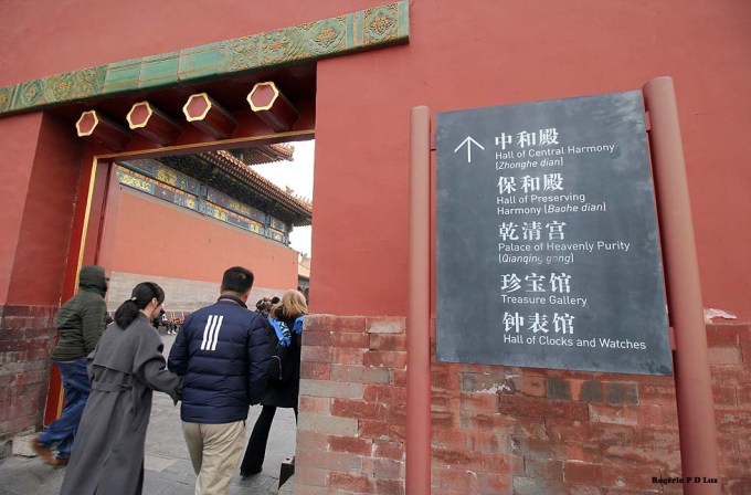 Placa na porta lateral da Galeria da Harmonia Suprema indica o acesso à Galeria da Harmonia Central, Galeria da Harmonia Preservada, Palácio da Pureza Celestial, Galeria do Tesouro e a Sala de Relógios.