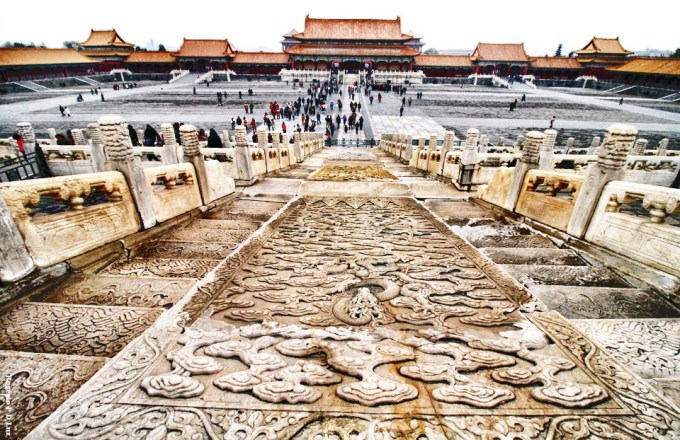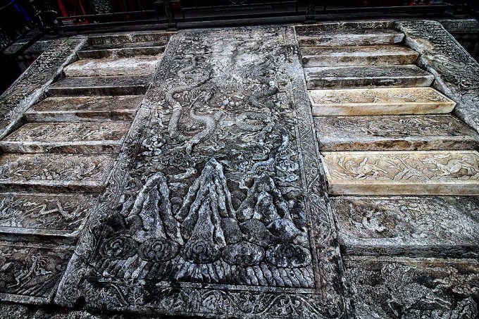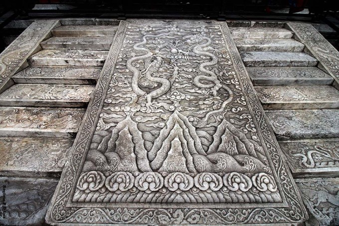 As escadarias de mármore com a rampa central esculpida de dragões: