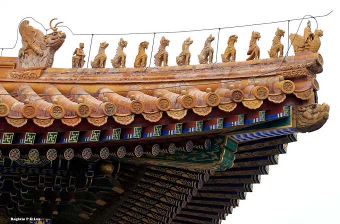 Os telhados de arestas inclinadas dos edifícios estão decoradas com uma linha de estatuetas. O número de estatuetas representa o estatuto do edifício — um edifício secundário deve ter 3 ou 5. A Galeria da Harmonia Suprema tem 10, o único edifício no país com permissão para ter tal número de estatuetas nos tempos imperiais. Como resultado, a sua décima estatueta (denominada de “Hangshi”, ou “décima classificada” é algo único nos edifícios pré-modernos.