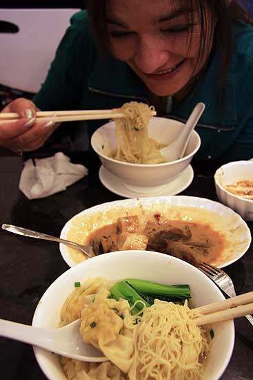 Servida em pratinhos de plástico e em doses de cinco garfadas parcas, mas equivalentes ao preço justo de trinta avos, nunca uma simples massa nos soube tão divinamente, ainda que só frita com rebentos de feijão mungo e tisnado pelo sutate (molho de soja) na frigideira quente (era aquilo a que, precisamente por isso, se chamava tchái-min, ou seja min “de dieta”).
