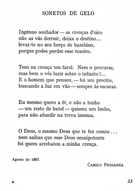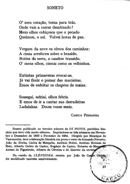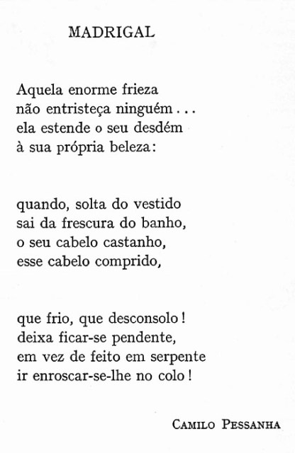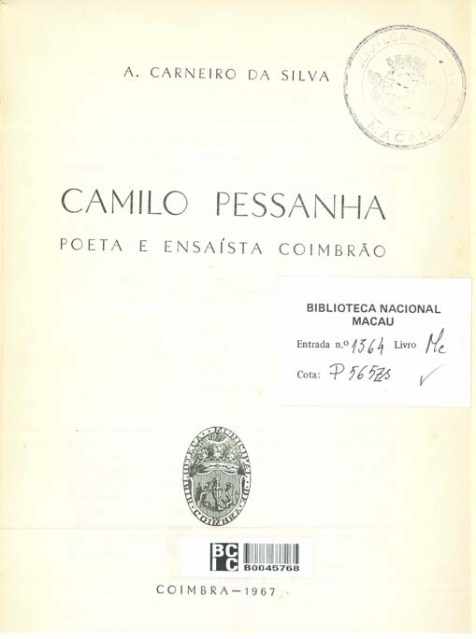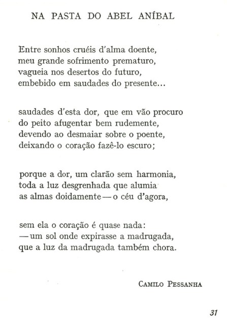(Wikipédia) Camilo de Almeida Pessanha (Coimbra, 7 de setembro de 1867 — Macau, 1 de março de 1926) foi um poeta português.