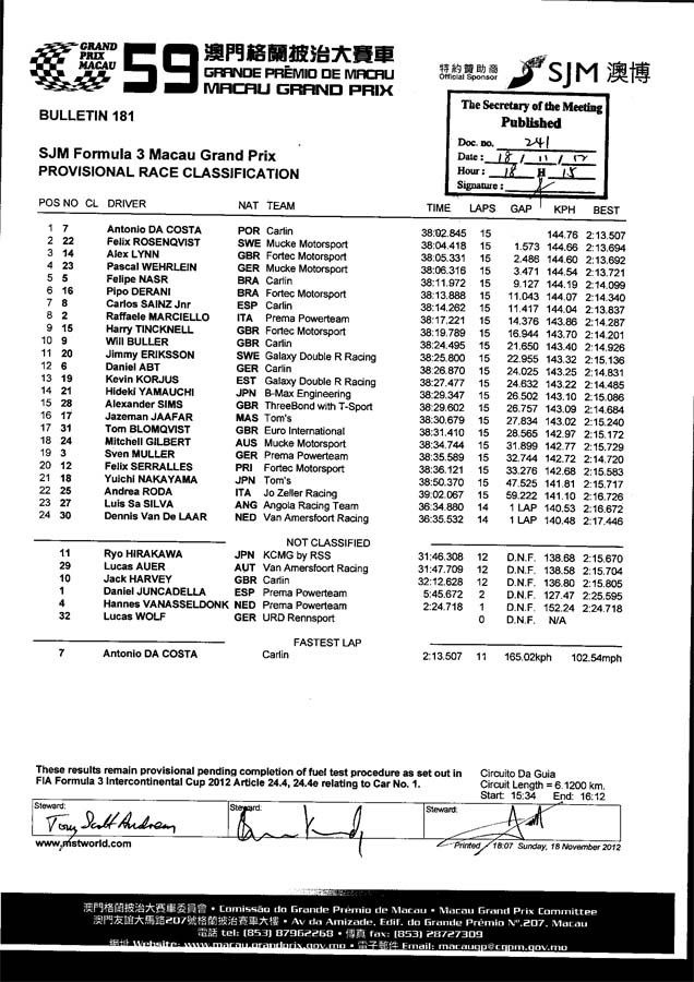 Félix da Costa vence o 30º Grande Prémio de Macau de F3 – 18/Novembro/2012