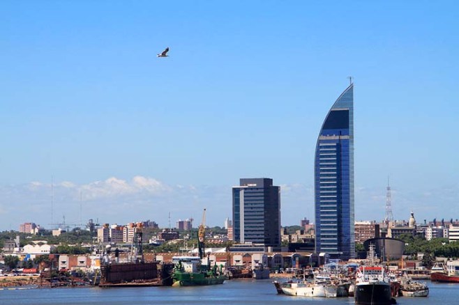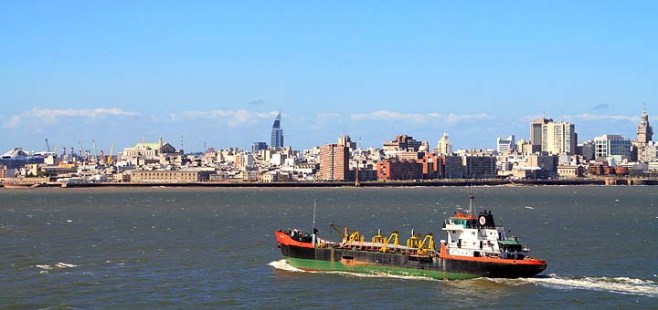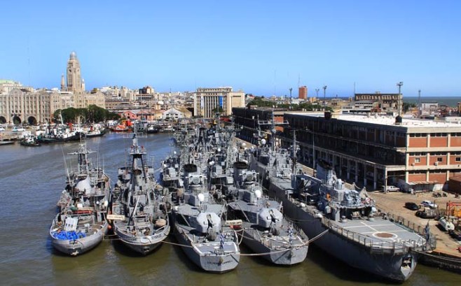 Navios de guerra da Armada Uruguaia. Ao fundo o centro velho que possui vários prédios históricos