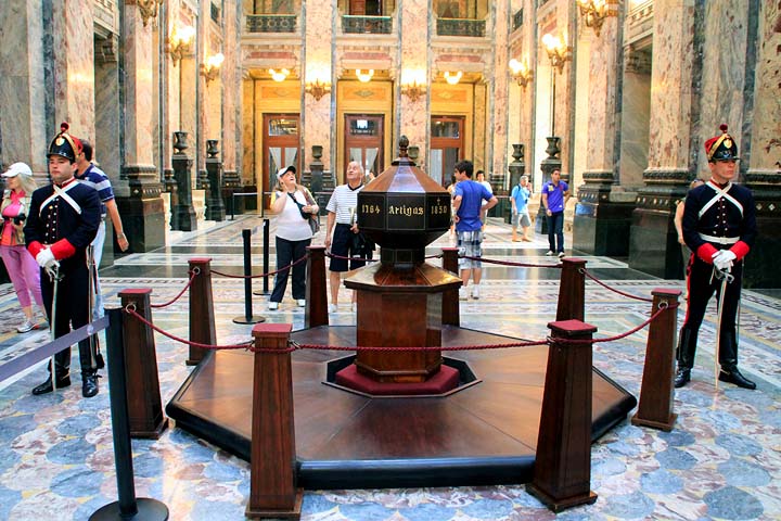 A urna com os restos mortais do herói nacional pela independência, General José Artigas, e sua guarda de honra. Este magnífico salão está totalmente recoberto em mármores e granitos nacionais, que foram extraidos de pedreiras dos departamentos de Lavalleja e Maldonado e do departamento de Canelones, respetivamente. Este salão divide simetricamente ao edifício, de um lado a Câmara dos Senadores e do outro a dos Deputados